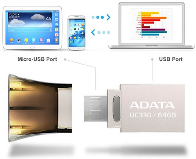 Adata lanzó su nuevo Disco Flash USB Dual, el UC330, que incorpora dos interfaces, una Micro USB y otra USB estándar lo que la hace compatible tanto con computadoras como con dispositivos móviles (basados en Android).