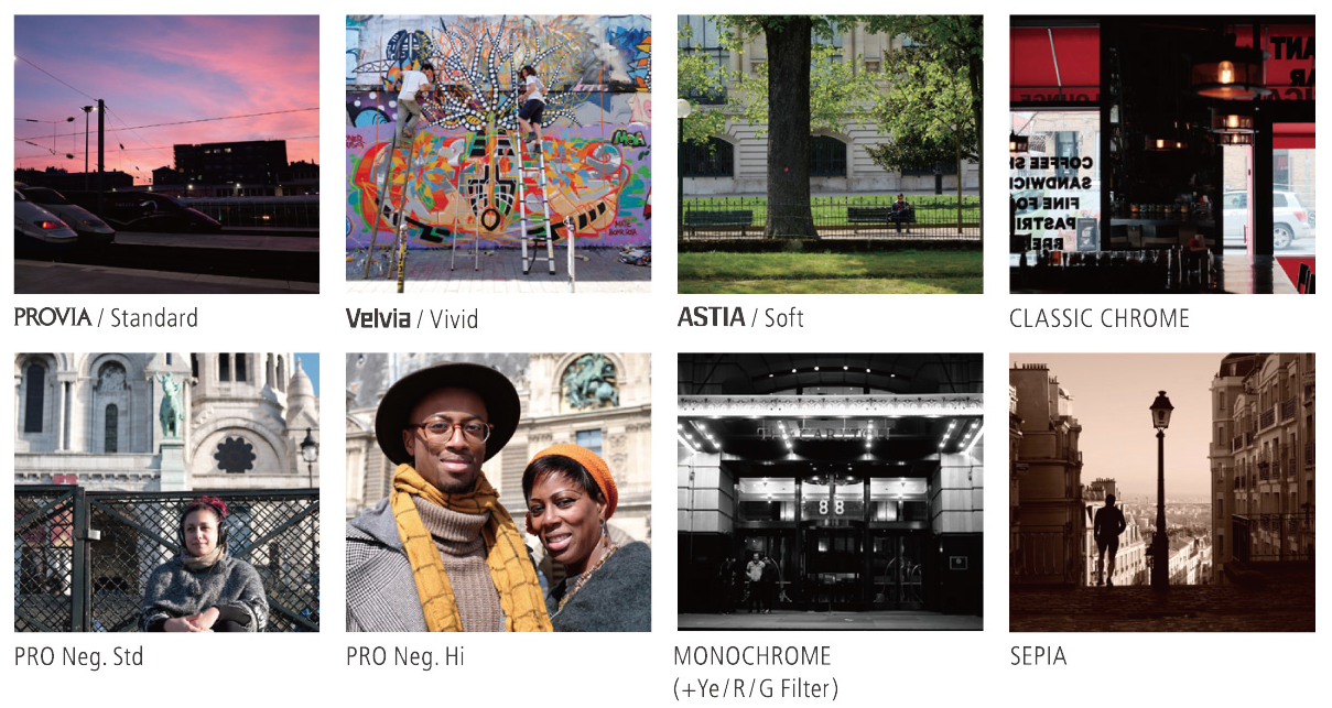 - Simulación de película, incluyendo CLASSIC CHROME el cual genera una amplia variedad de tonalidades grises y negras, así como 10 modos que simulan las tradicionales películas FUJIFILM. Inversos de color (VELVIA / PROVIA / ASTIA), película negativa en color profesional (PRO Neg.Std / PRO Neg.Hi), filtros en blanco y negro (BLANCO Y NEGRO, filtro amarillo, rojo y verde) y SEPIA.