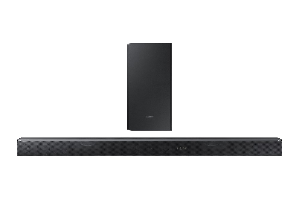 Samsung también presentó un Soundbar que es el primer sistema de audio con altavoces inalámbricos y el soporte de audio Dolby Atmos que cuenta con bocina trasera inalámbrica que dispersa el audio regular a uno surround y overhead que, hasta hace poco tiempo, era exclusivo de las salas de cine.