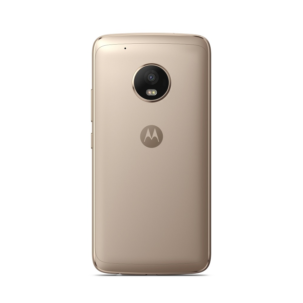 El primer modelo Moto G con diseño metálico gris obscuro o dorado, batería de 2800 mAh de larga duración, cargador rápido de 10 W, procesador octa-core de 1.4 GHz Qualcomm Snapdragon 430 y 2 GB de memoria RAM.